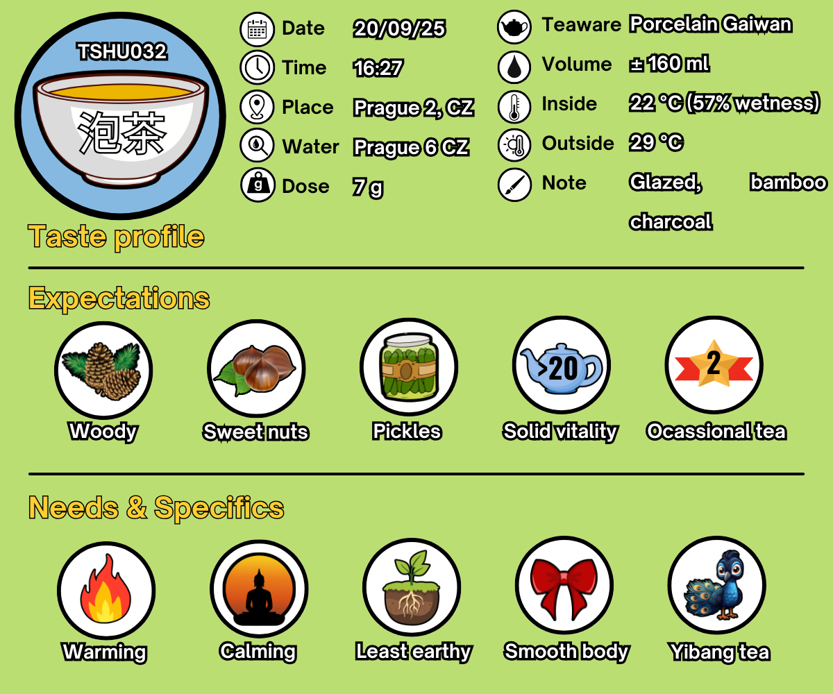 - Wet + dry leaf (Shicha 湿茶 + Gancha 干茶) - pine tree fragrance with nutty and molasses tones