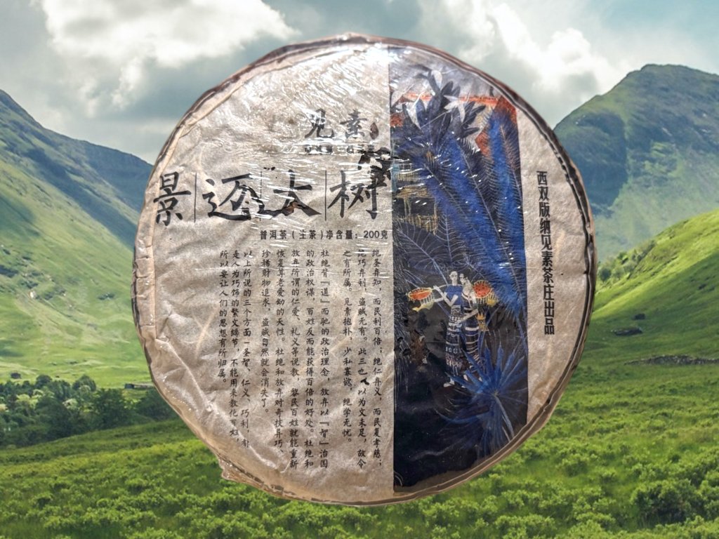 Aged sheng puer from Jingmai Tea Mountain (景迈山). Tea was harvested and compressed in Spring 2006. The tea leaves come from old tea trees (dashu 大树), which were collected across Jingmai tea gardens at the elevation between 1200-2000 m.a.s.l. The cover has a beatiful design depicting women from Bulang and Dai tribes living in Jingmai tea gardens, one of the six ancient tea mountain in Xishuangbanna (guliu dachashan 古六大茶山) and long reference on holy wisdom of life.