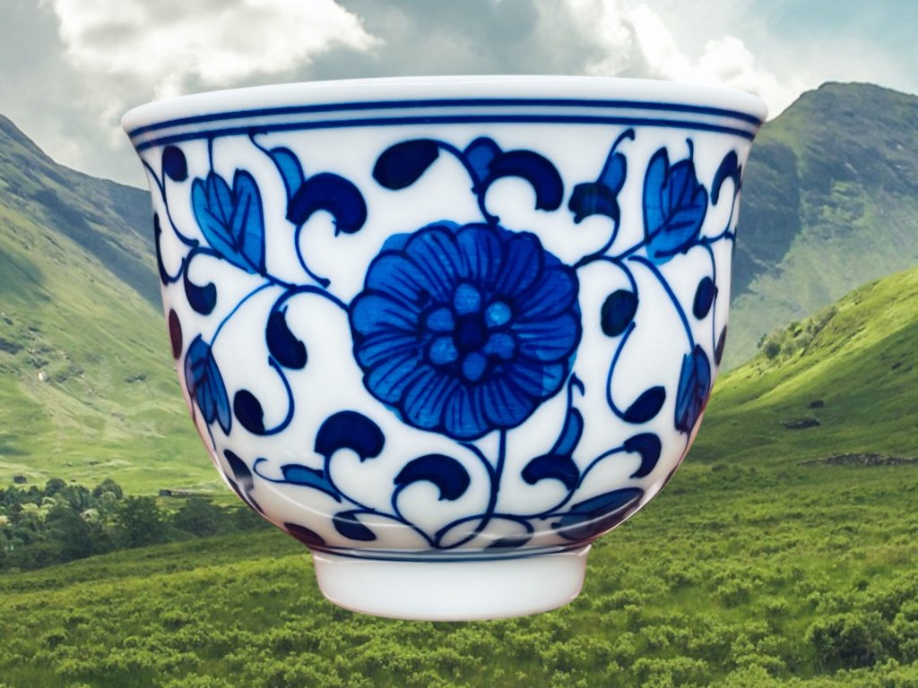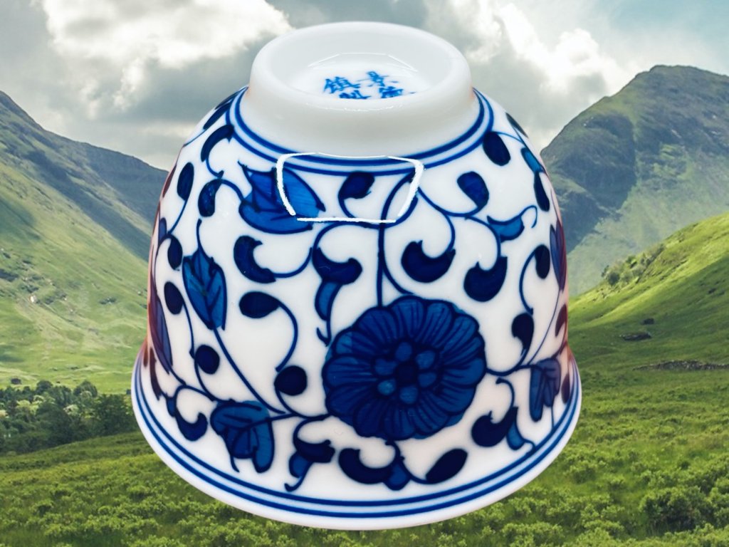 Objevte půvab tradičního a ručně vyráběného čínského porcelánu z Jingdezhen, prastarého města s více než 1000 letou historií výroby čajové keramiky a porcelánu z čínské provincie Jiangxi (江西). Tento čajový šálek zdobí elegantní ručně malované květiny v tmavých kobaltově modrých odstínech (qinghua 青花). Díky vysokoteplotnímu výpalu má glazura na povrchu jemné praskliny, které každému šálku dodávají jedinečný charakter a jemnou prastarou texturu. Glazovaný šálek je vhodný pro přípravu všech typů čajů. Malba je nanášena pod glazurou. Pečeť nese nápis "vyrobeno v Jingdezhen" (景德镇制).