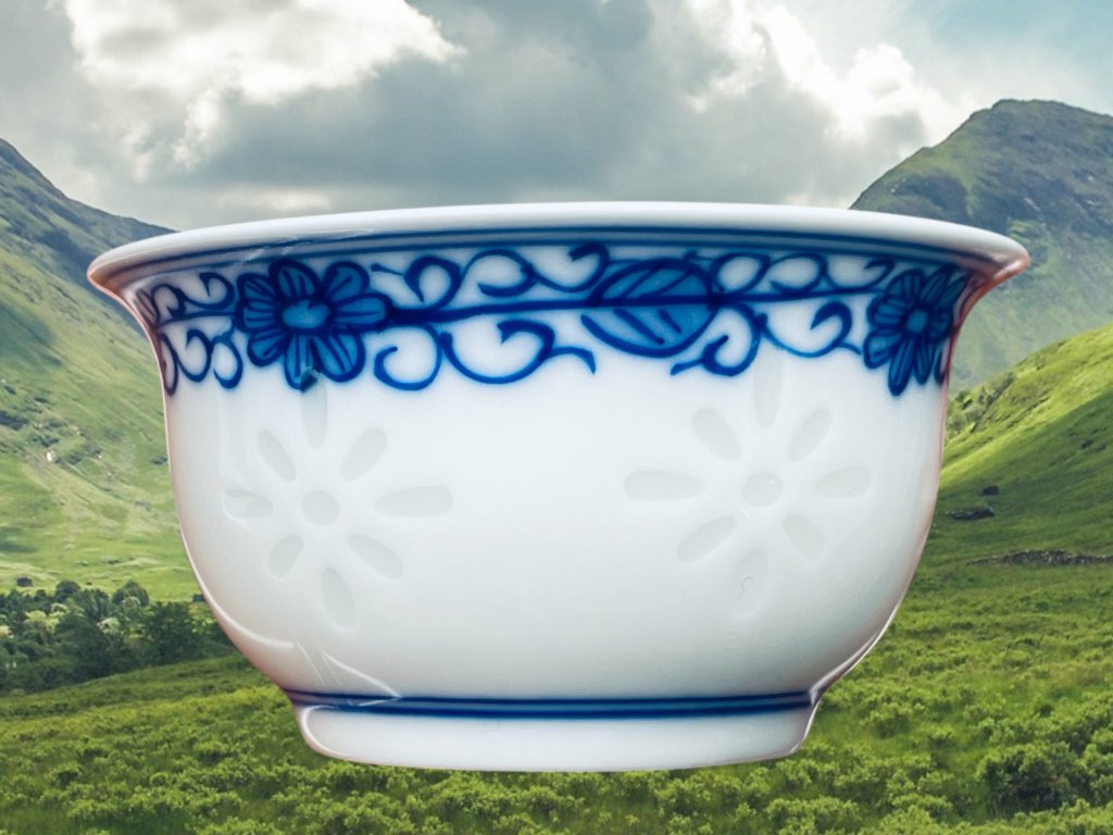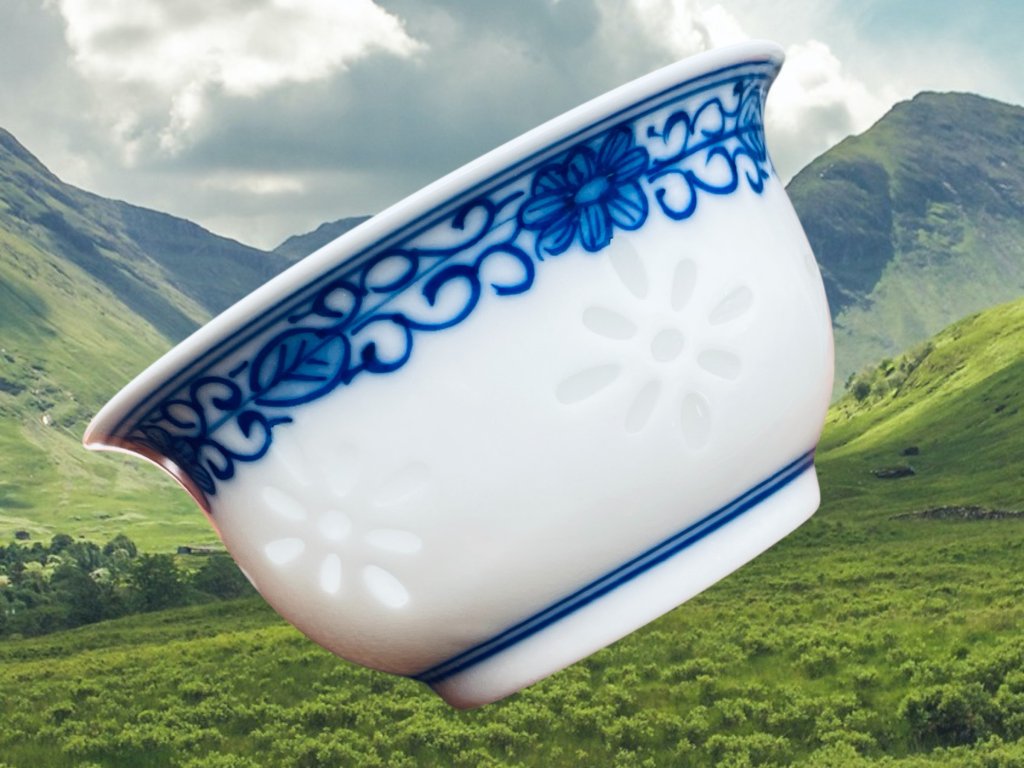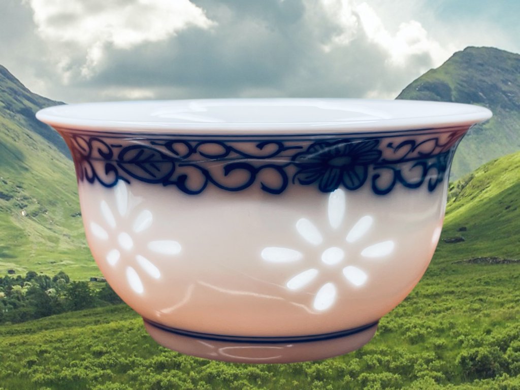 Objevte půvab tradičního a ručně vyráběného čínského porcelánu z Jingdezhen, prastarého města s více než 1000 letou historií výroby čajové keramiky a porcelánu z čínské provincie Jiangxi (江西). Tento čajový šálek zdobí elegantní ručně malovaná krajina v tmavých kobaltově modrých odstínech (qinghua 青花) a překrásná průsvitná okýnka vyplněná glazurou vytvořená tradiční "rýžovou" technikou (Linglong 玲珑). Díky vysokoteplotnímu výpalu má glazura na povrchu jemné praskliny, které každému šálku dodávají jedinečný charakter a jemnou prastarou texturu. Glazovaný šálek je vhodný pro přípravu všech typů čajů. Malba je nanášena pod glazurou. Pečeť nese nápis "vyrobeno v Jingdezhen" (景德镇制).