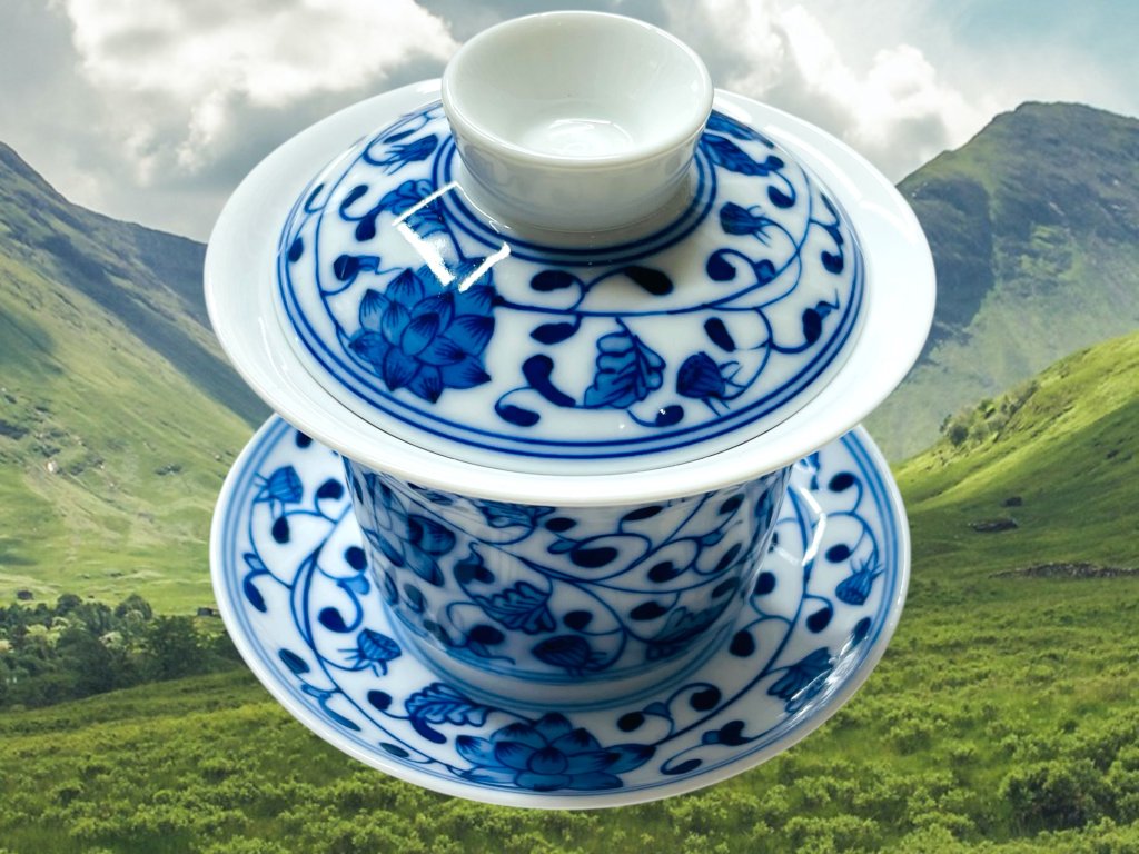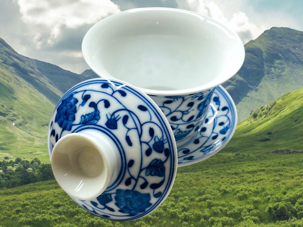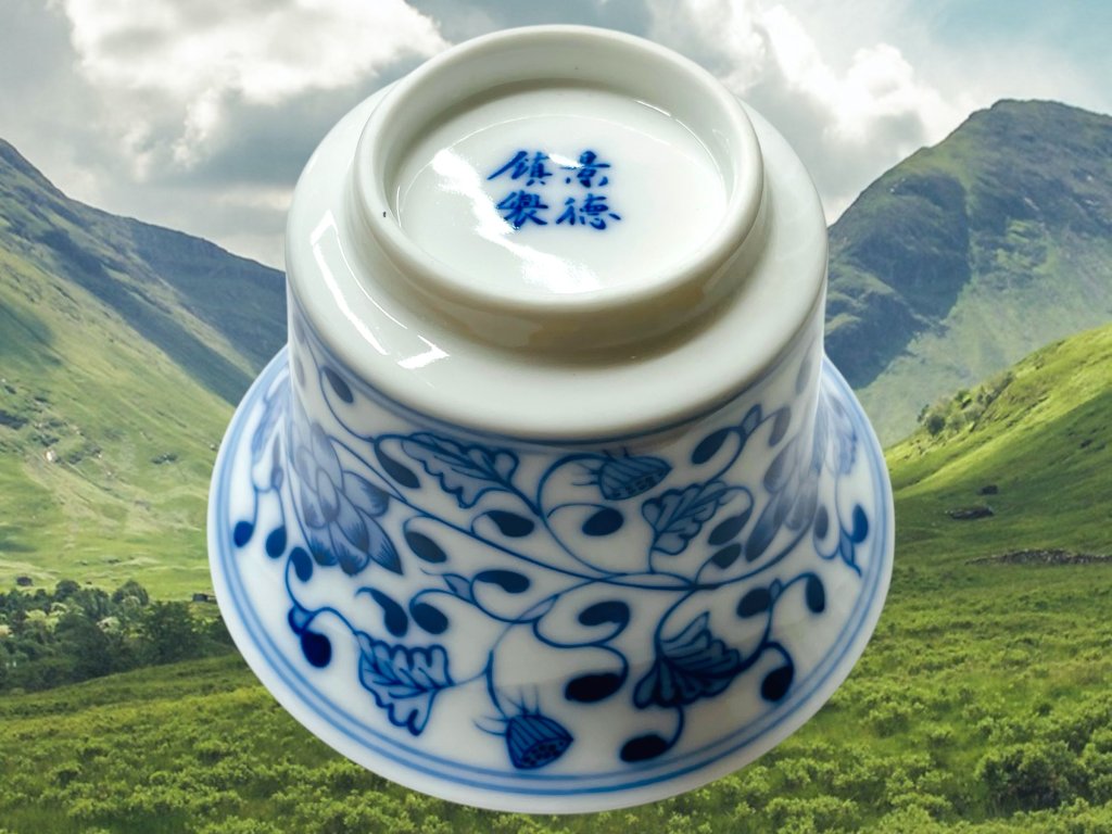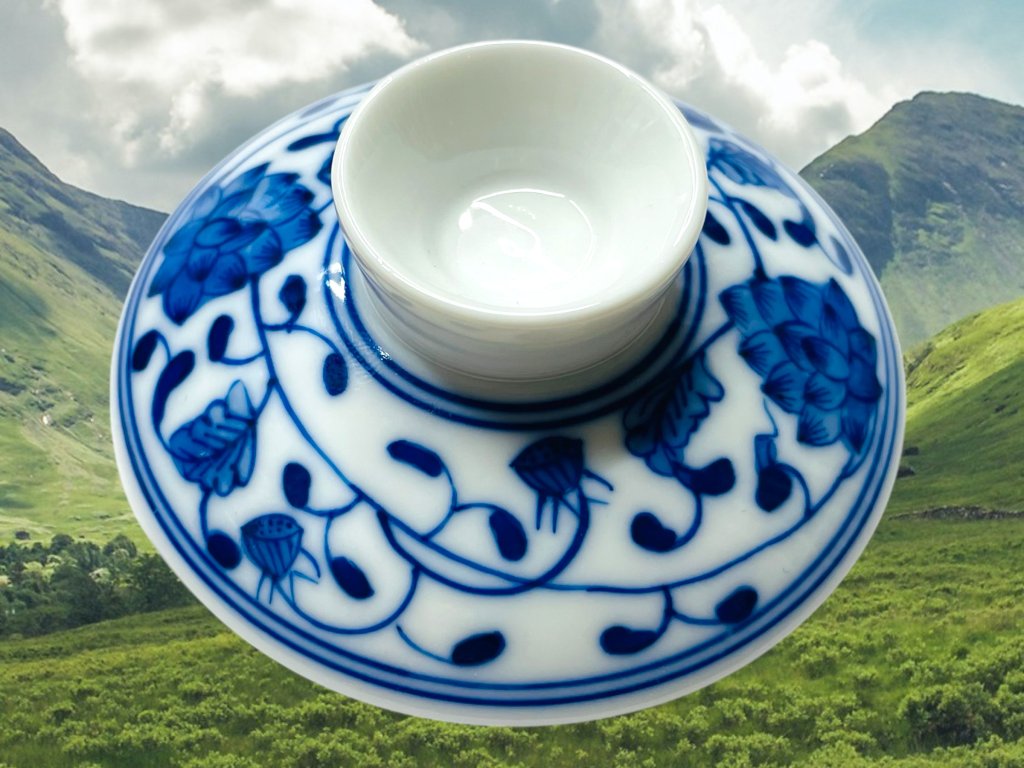 Objevte půvab tradičního a ručně vyráběného čínského porcelánu z Jingdezhen, prastarého města s více než 1000 letou historií výroby čajové keramiky a porcelánu v čínské provincii Jiangxi (江西). Tento gaiwan zdobí elegantní ručně malovaný motiv květin využívající techniku hluboké kobaltově modré malby charakteristický pro modro-bílý porcelán (qinghua 青花). Pečetě nesou nápis "vyrobeno v Jingdezhen" (景德镇制).