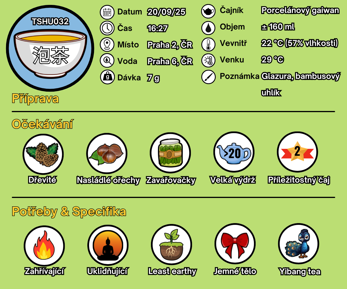 - Mokrý + suchý list (Shicha 湿茶 + Gancha 干茶) - vůně jehličnanů s tóny oříšků a melasy