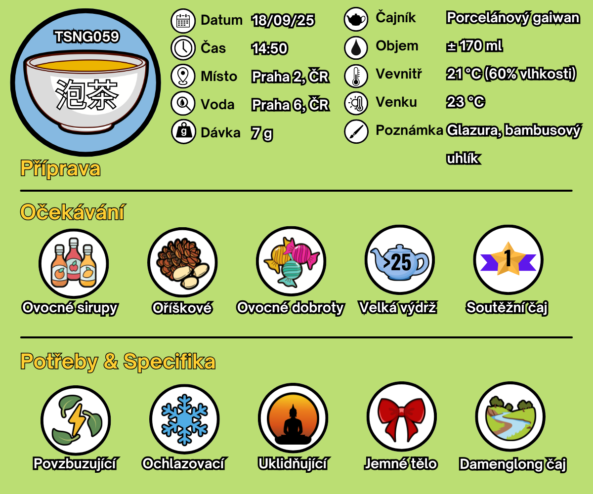 - Svíravost (Se 涩) -podobně jako u ostatních čerstvých sklizní sheng puerů (2025–2022) lze zaznamenat určitou svíravost, zejména v pozdější fázi a v dochuti, která však na chuťovém prožitku nijak neruší a příjemně doplňuje onu širokou paletu chutí