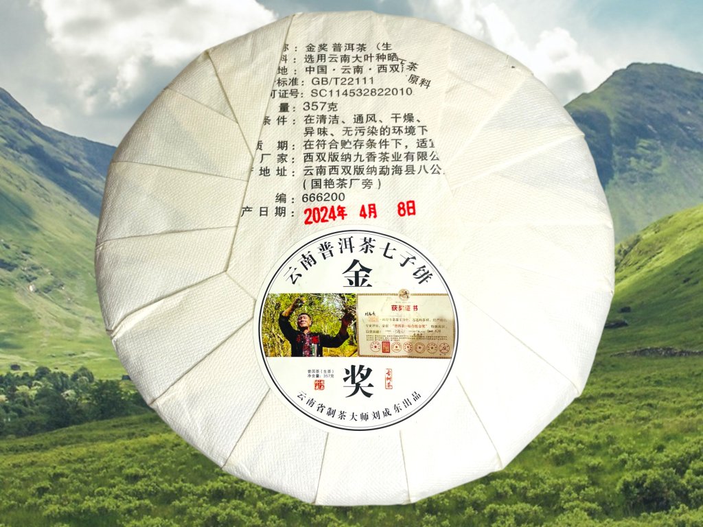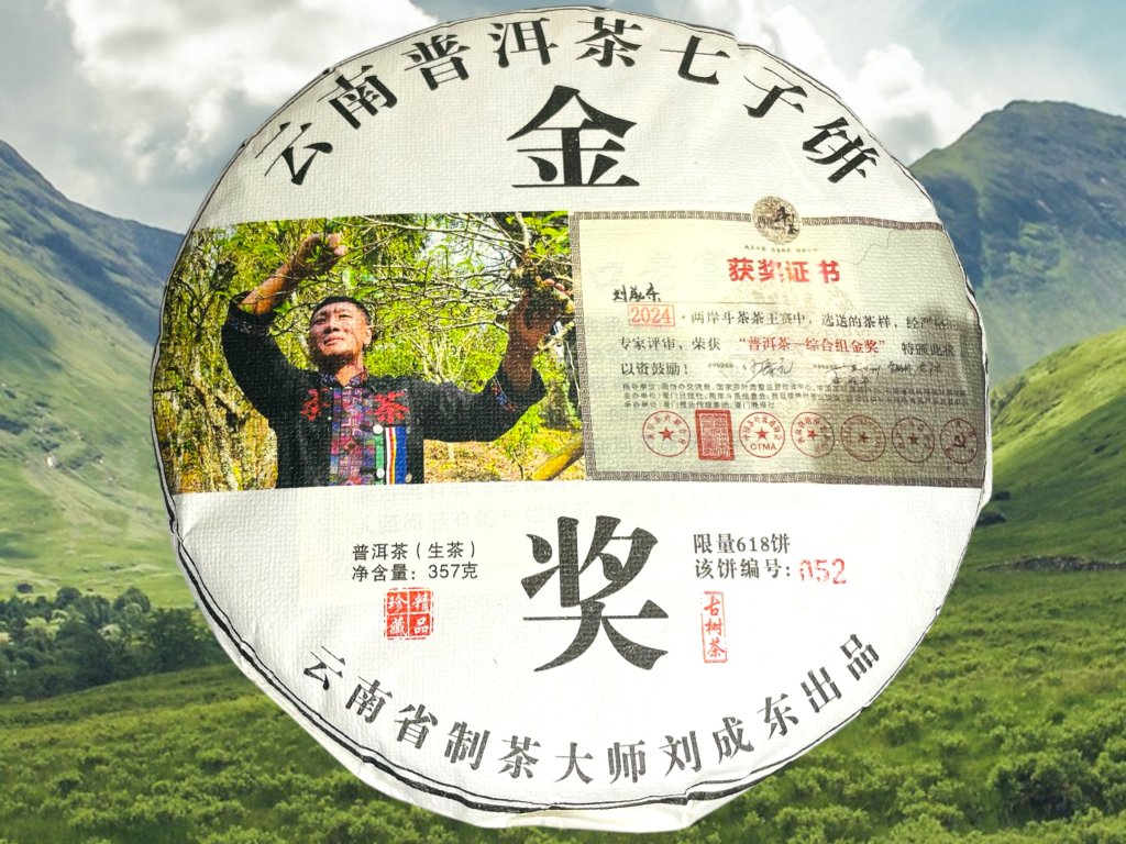 Soutěžní sheng puer z vesnice Mengsong (勐宋村) v mikroregionu Damenglong (大勐龙). Damenglong se nachází přibližně 60 km od města Jinghong (景洪市) v odlehlé pohraniční oblasti mezi Čínou a Myanmarem. Čaj byl sklizen a lisován během první jarní sklizně roku 2024 (Touchun 头春), která je mnohem vzácnější a žádanější s ohledem na sladší a vrstevnatější chuť. Čajové lístky pochází z prastarých čajových stromů (gushu 古树), které byly sbírány napříč čajovými zahradami nedaleko vesnice Mengsong v nadmořské výšce okolo 1000 m.n.m. Obal zobrazuje Liu Chengdonga během sklizně a odkazuje na ocenění zlaté medaile (jinjiang 金奖), kterou obdržel na soutěži Cross-Strait King Tea Competition v Xiamenu v kategorii puer čajů (两岸斗茶茶王赛, 2024). Takové ocenění, uznávající výjimečnou chuť z Damenglongu, je nevídané, vezmeme-li v potaz, že zde soutěžilo pouze deset předem vybraných soutěžících za čínskou provincii Yunnan (云南省). Přestože v roce 2024 bylo vyrobeno pouze 618 čajových koláčů (357 g), tak máme to štěstí být hrdými vlastníky koláčů č. 51 a č. 52, které nyní můžete ochutnat.